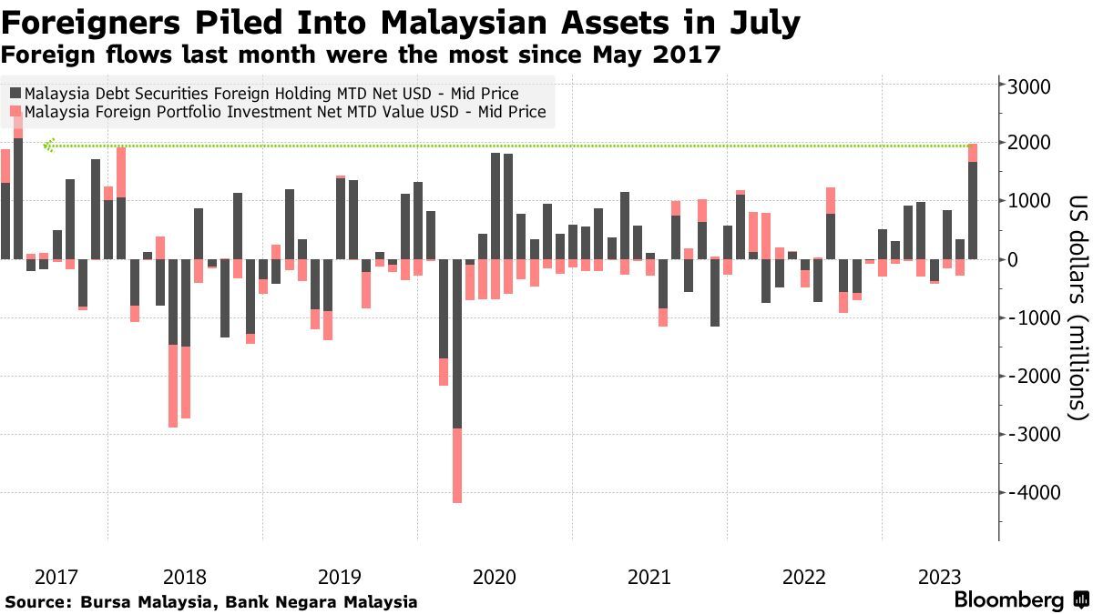 在这些资金流入之前,马来西亚经历了艰难的上半年,其股市和货币在亚洲地区的表现中排名垫底。海外资金的流入帮助扭转了这一局面,令马来西亚林吉特成为过去一个月里表现最好的货币,马来西亚股市也在同一时期内上涨了5%以上。