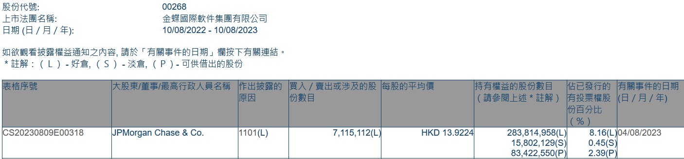 智通财经APP获悉,香港联交所最新资料显示,8月4日,小摩增持金蝶国际(00268)711.5112万股,每股作价13.9224港元,总金额约为9905.94万港元。增持后最新持股数目约为2.84亿股,最新持股比例为8.16%。