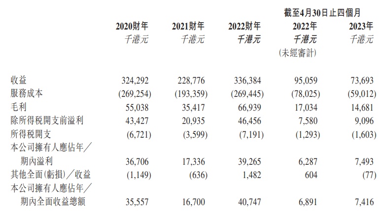财务方面,于2020年度、2021年度、2022年度以及2022年、2023年4月30日止四个月,泓基集团实现收益分别为3.24亿港元、2.29亿港元、3.36亿港元、9505.9万港元、7369.3万港元。其中,公司期内溢利分别为3670.6万港元、1733.6万港元、3926.5万港元、628.7万港元、749.3万港元。