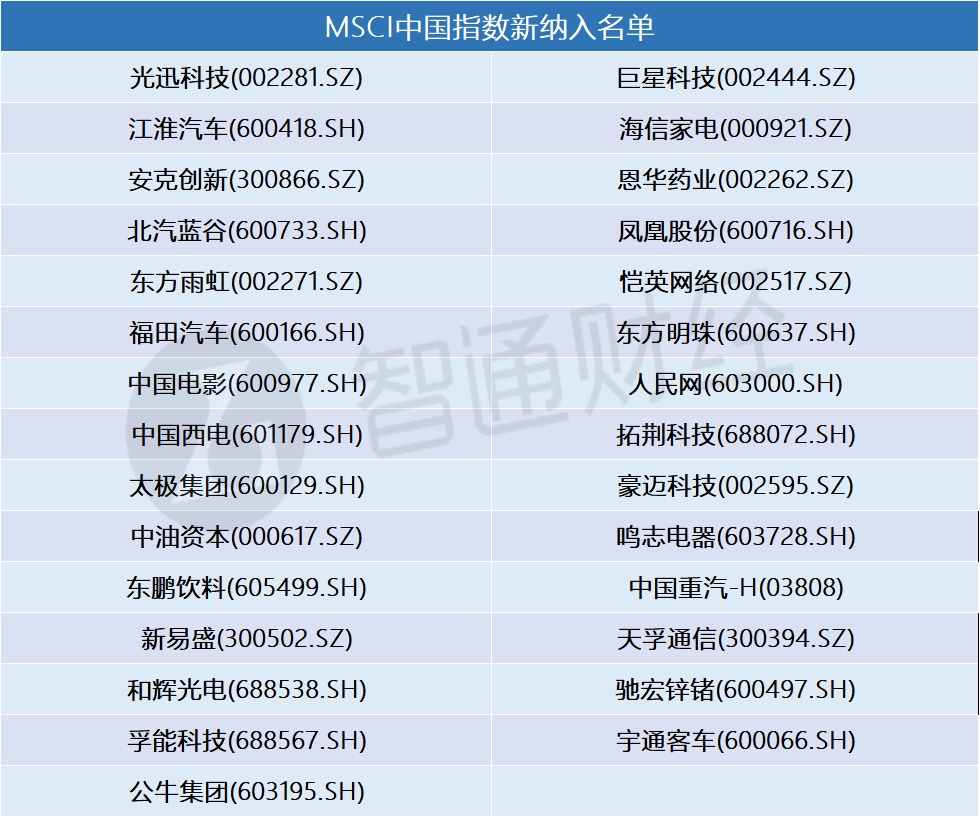 智通财经APP获悉,8月11日,国际指数编制公司MSCI公布了2023年8月指数审议结果。在本次调整中,MSCI中国指数新纳入29只中国股票,剔除19只。纳入标的中,市值最大的几只股票分别是,中油资本(000617.SZ)、公牛集团(603195.SH)和东鹏饮料(605499.SH)。此外,中国电影(600977.SH)、宇通客车(600066.SH)、海信视像(600060.SH)等也获纳入。剔除标的包括,达安基因(002030.SZ)、复旦微电(688385.SH)、康龙化成(300759.SZ)等19只股票。调整将于8月31日收盘后生效。值得注意的是,被MSCI中国指数新纳入的个股,往往在当天尾盘迎来海外被动指数资金卡点买入。