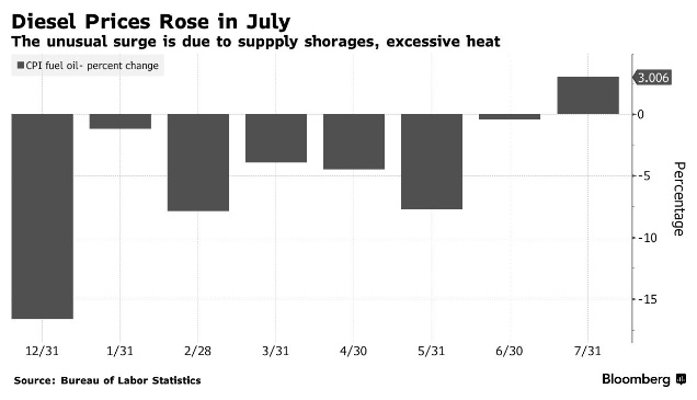 智通财经APP获悉,柴油价格在夏季不同寻常的涨势,正开始体现在美国的通胀数据上。根据美国劳工统计局的数据,7月份燃料油价格出现八个月来的首次上涨,加剧了整体能源通胀,涨幅超过了汽油价格。上个月,消费者不得不为柴油支付更多的价格,因为极端高温在一定程度上导致了库存本已很低的关键地区大量炼油厂停产。