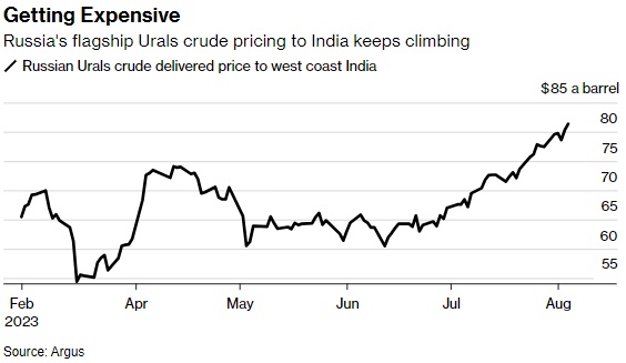 Argus Media Ltd.的定价数据显示,8月4日运往印度西海岸的乌拉尔原油价格超过每桶81美元,而一个月前约为每桶68美元。