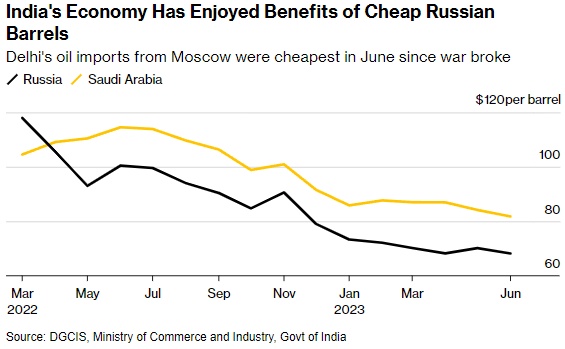 最简单的驱动因素仍然是价格。官方数据显示,今年6月,包括运费在内,俄罗斯原油抵达印度海岸的平均成本为每桶68.17美元,为俄乌冲突以来的最低水平。相比之下,来自沙特阿拉伯的进口额为81.78美元。