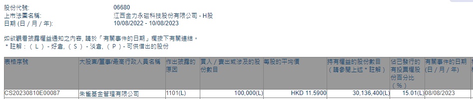 智通财经APP获悉,香港联交所最新资料显示,8月8日,朱雀基金增持金力永磁(06680)10万股,每股作价11.59港元,总金额约为115.90万港元。增持后最新持股数目为3013.64万股,最新持股比例为15.01%。