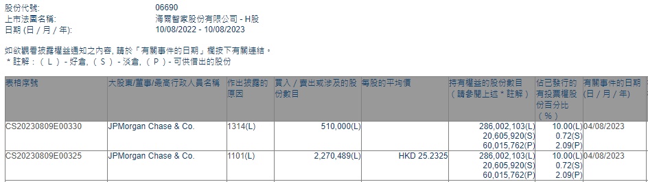 智通财经APP获悉,香港联交所最新资料显示,8月4日,小摩增持海尔智家(06690)227.0489万股,每股作价25.2325港元,总金额约为5728.47万港元。增持后最新持股数目约为2.86亿股,最新持股比例为10.00%。
