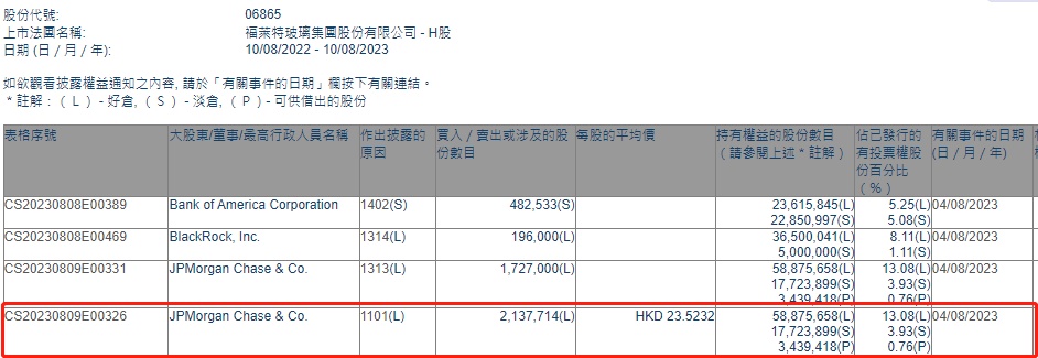 智通财经APP获悉,香港联交所最新资料显示,8月4日,小摩增持福莱特玻璃(06865)213.7714万股,每股作价23.5232港元,总金额约为5028.59万港元。增持后最新持股数目约为5887.57万股,最新持股比例为13.08%。