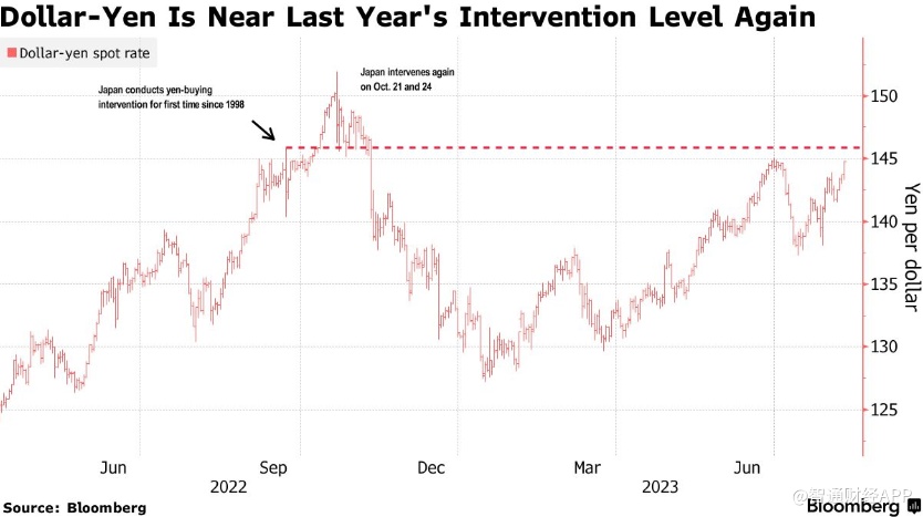 去年末日元明显走软,促使日本当局三次入市。第一次干预发生在日元汇率跌向1美元兑146日元时。