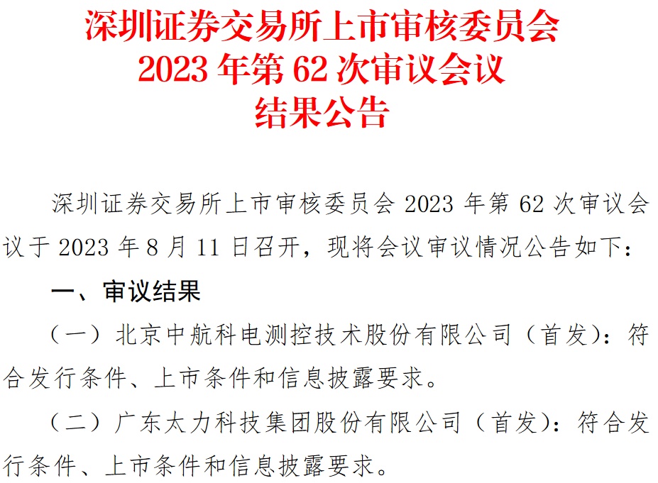 智通财经APP获悉,8月11日,深交所上市审核委员会2023年第62次审议会议结果公告,广东太力科技集团股份有限公司、北京中航科电测控技术股份有限公司首发获通过。