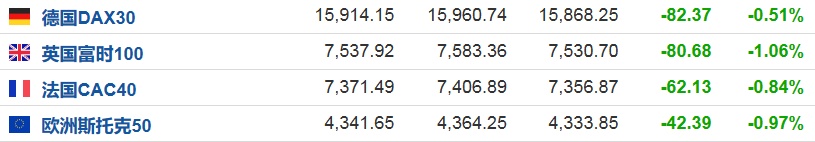 2.截至发稿,德国DAX指数跌0.51%,英国富时100指数跌1.06%,法国CAC40指数跌0.84%,欧洲斯托克50指数跌0.97%。