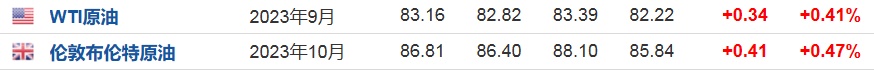 3. 截至发稿,WTI原油涨0.41%,报83.16美元/桶。布伦特原油涨0.47%,报86.81美元/桶。