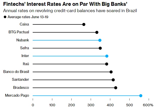 在巴西,6月底有近7200万人拖欠债务。银行通过提高贷款利息来弥补这一损失。据西班牙央行的数据,到当月中旬,Nubank和Mercado Pago的信用卡循环额度平均利率分别达到近350%和560%。借款人的利率差异很大,在某些情况下一些借款人的利率甚至高出数百个百分点。为了保护收益,该公司提高了信用卡的利率——在某些条件下达到了790%!