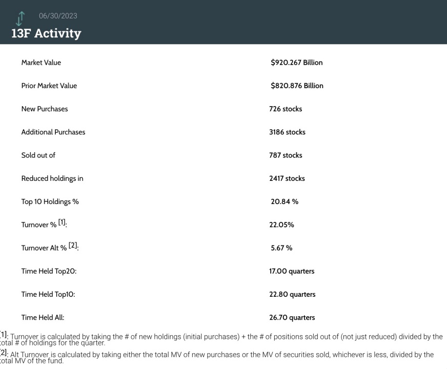 摩根大通Q2持仓总市值为9202亿美元,上一季度为8208亿美元,环比增长12%。摩根大通在Q2的投资组合中新增了726只标的,增持3186只标的,减持2417只标的,清仓787只标的;其中前十大持仓标的占总市值的20.84%。