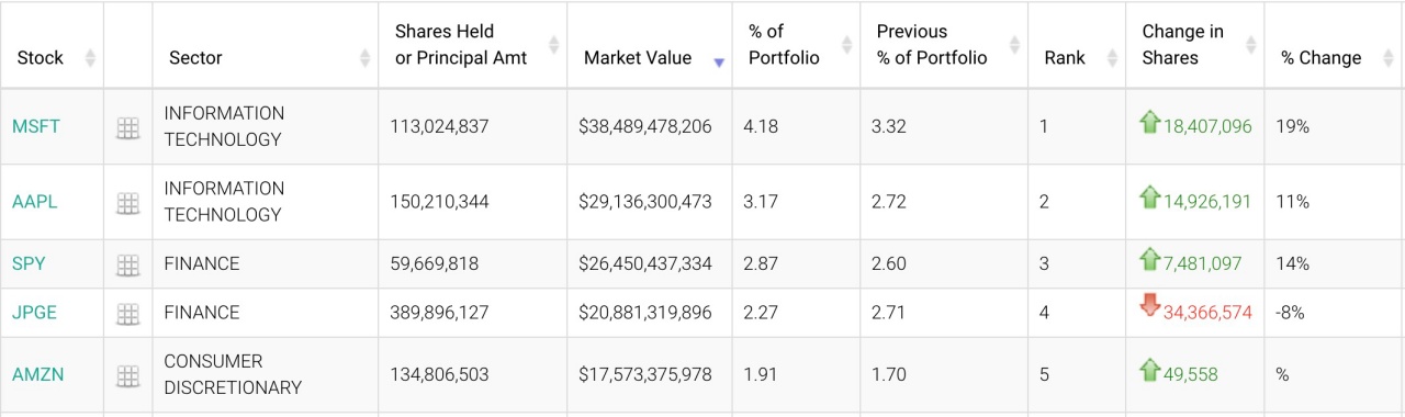 在前五大重仓股中,微软(MSFT.US)位列第一,持仓1.13亿股,持仓市值约384.89亿美元,占投资组合比例为4.18%,持仓数量较上季度增加19%。