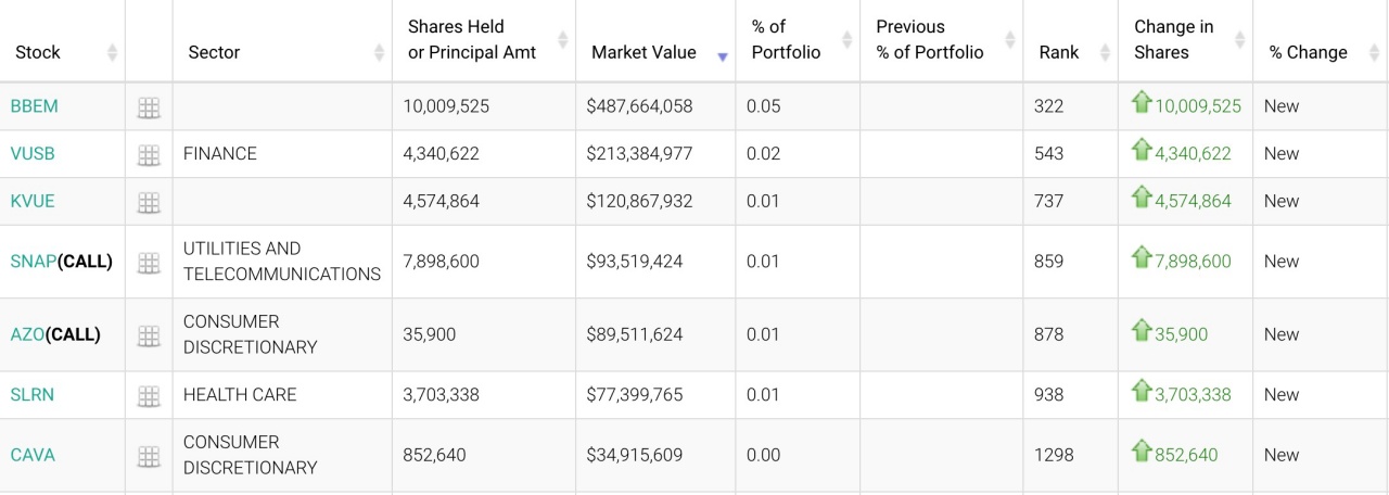 新建仓方面,小摩建仓中心为JPMorgan BetaBuilders Emerging Markets Equity ETF(BBEM),持仓市值约为4.87亿美元。其次,小摩建仓VANGUARD ULTRA-SHORT BOND ETF-ETF Shares (VUSB) 约434万股,持仓市值约为2.13亿美元。