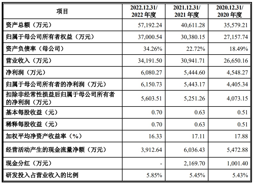 财务方面,于2020年度、2021年度及2022年度,公司实现营业收入分别约为2.67亿元、3.09亿元、3.42亿元。公司净利润分别约为4548.27万元、5444.6万元、6080.27万元人民币。