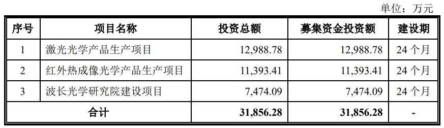 据了解,波长光电募集资金扣除发行费用后拟用于以下列项目: