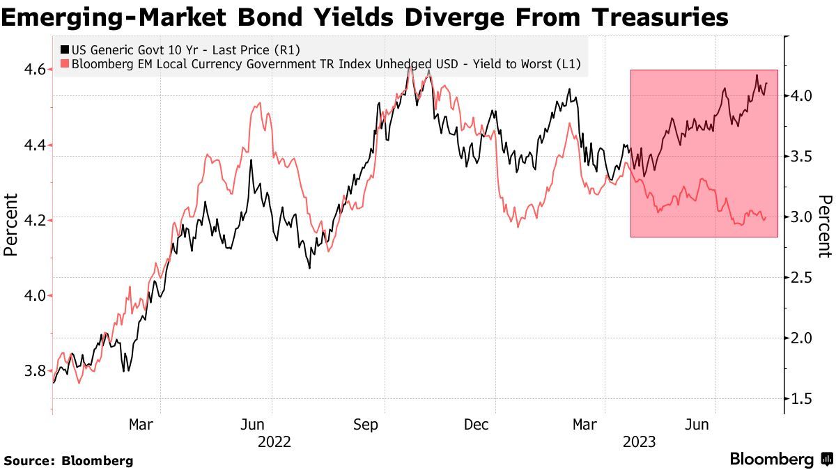 人们越来越乐观地认为,美联储能够在不引发经济衰退的情况下抑制通胀,这也使得新兴市场债券比发达市场债券更受青睐。Gama Asset Management SA的全球宏观投资组合经理Rajeev De Mello表示:“发达市场债券收益率走高预示着全球经济衰退的可能性降低。”“我预计,更具弹性的全球经济增长将成为新兴市场资产的主导力量。”