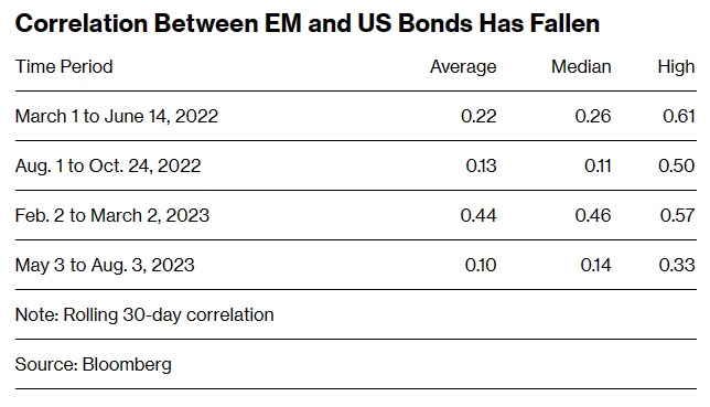智通财经APP获悉,新兴市场债券通常会在美债收益率飙升的情况下被投资者抛售。然而,一系列有利于新兴市场债券的积极因素正在改变这一趋势。在美债收益率走高的情况下,以本币计价的新兴市场债券延续了今年以来的涨势,原因是投资者对新兴市场降息的预期日益升温、以及对全球经济前景的乐观情绪。一项研究显示,新兴市场债券收益率与美债收益率之间的相关性已降至几乎为零,