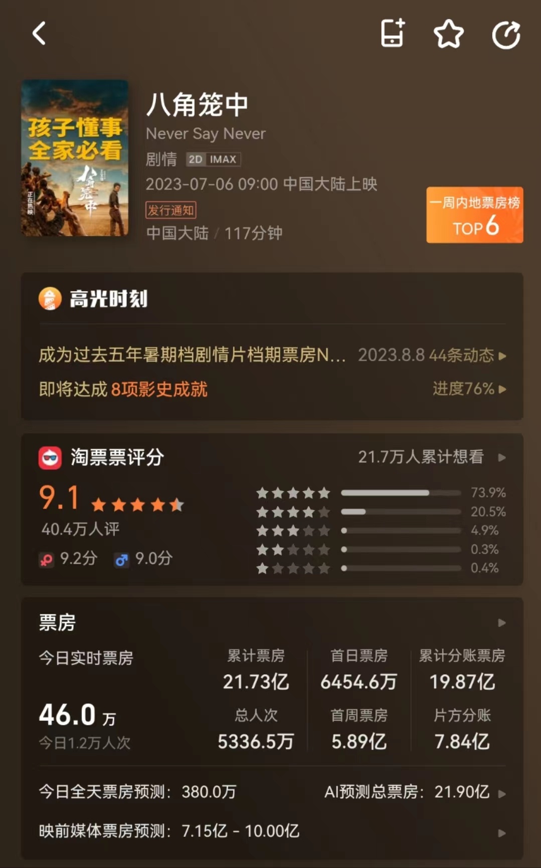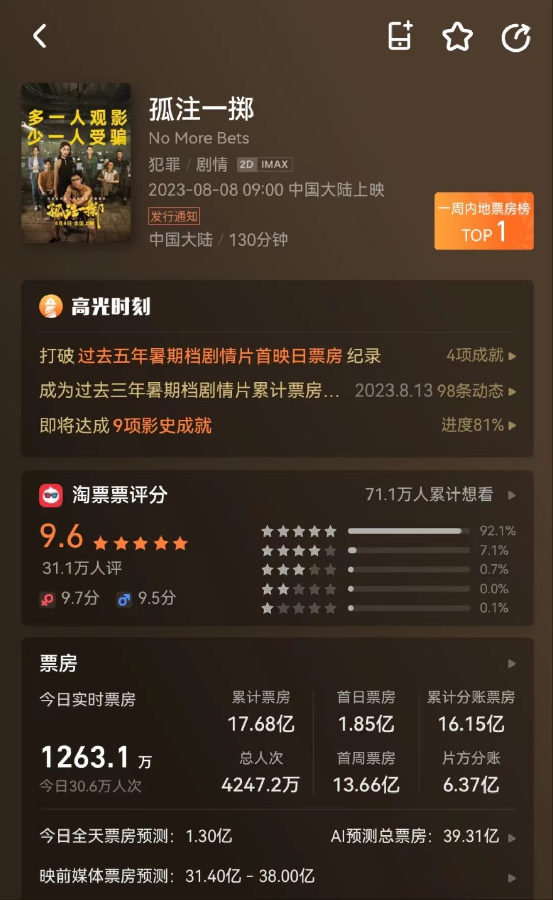 据悉,截至8月11日18时,暑期档票房已突破160亿元。8月10日上映的《孤注一掷》追赶迅猛,据灯塔专业版8月14日数据显示,《孤注一掷》总票房已破17亿元,灯塔AI预测最终总票房或达到40亿元。距离2023年暑期档结束虽然仅剩20天,但《孤注一掷》或将带领暑期档总票房实现最后一跃。