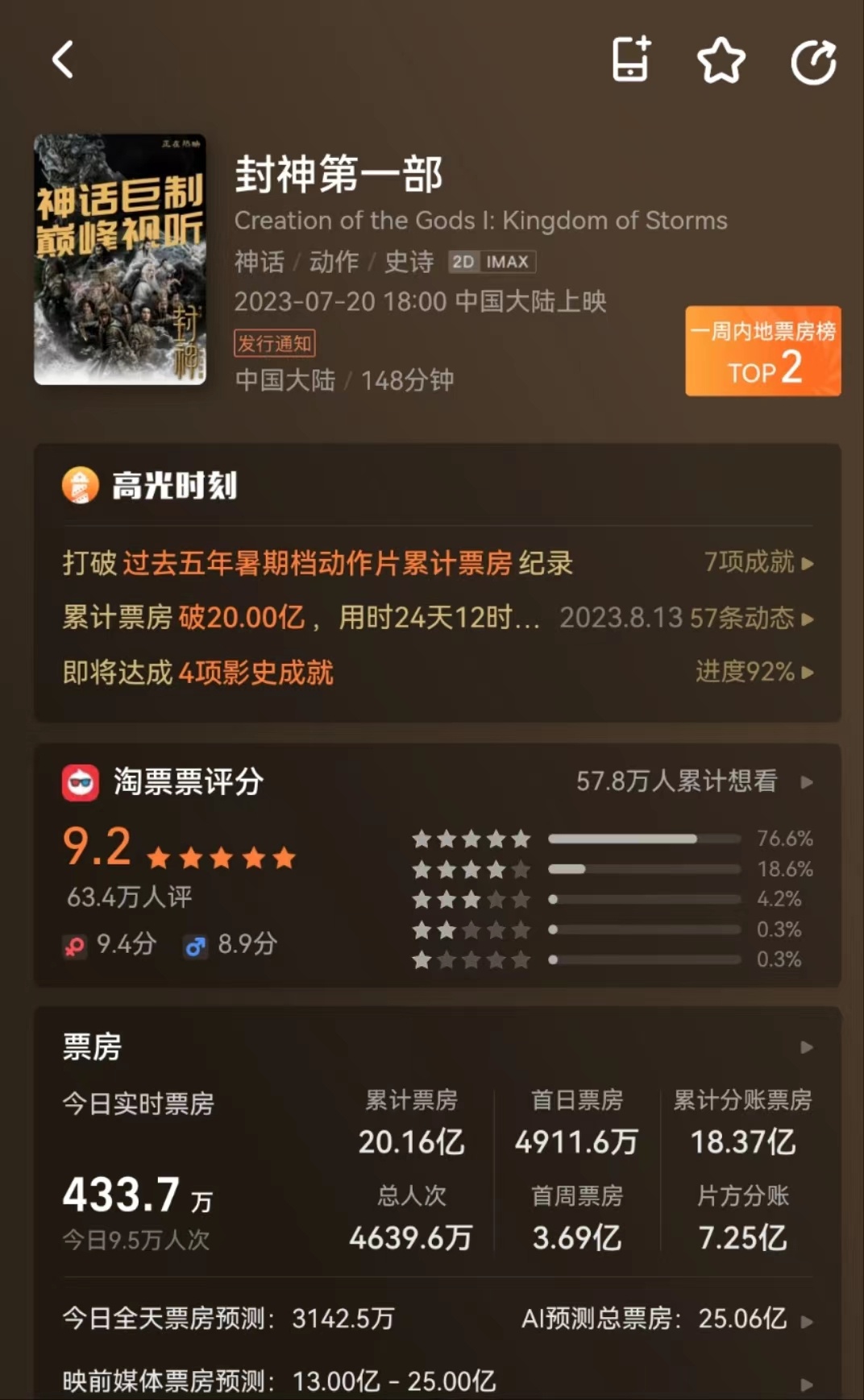 智通财经APP获悉,据灯塔专业版数据显示,截至8月13日,2023年暑期档已有3部影片累计票房突破20亿,分别为《消失的她》《八角笼中》《封神第一部》。市场人士认为,在暑期档优质影片的持续供给下,叠加相关促消费的政策陆续出台以及部分地区电影优惠券的发放,下半年影企业绩有望延续亮眼表现。此外,中国青年剧作家导演向凯表示,如果后半程新片持续发力,完全有可能超越2019年暑期档总票房。