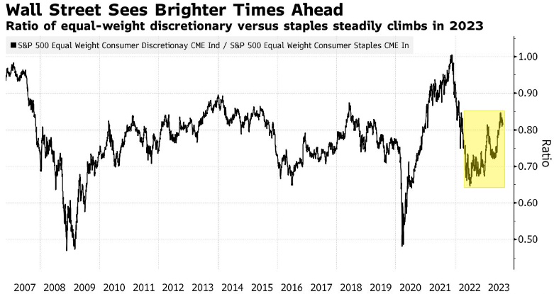 长期以来,非必需品类股票的等权重指数(该指数包括亚马逊等)相对于必需品类股的表现,一直是华尔街对经济的看法和投资者风险偏好的一个明显标志。这一比率在2023年稳步攀升,这表明交易员认为美国经济将在明年避开衰退。Global Investments高级投资组合经理Thomas Martin表示:“这一比率告诉我们,投资者看到了光明的前景,希望增加投资组合中的风险。”