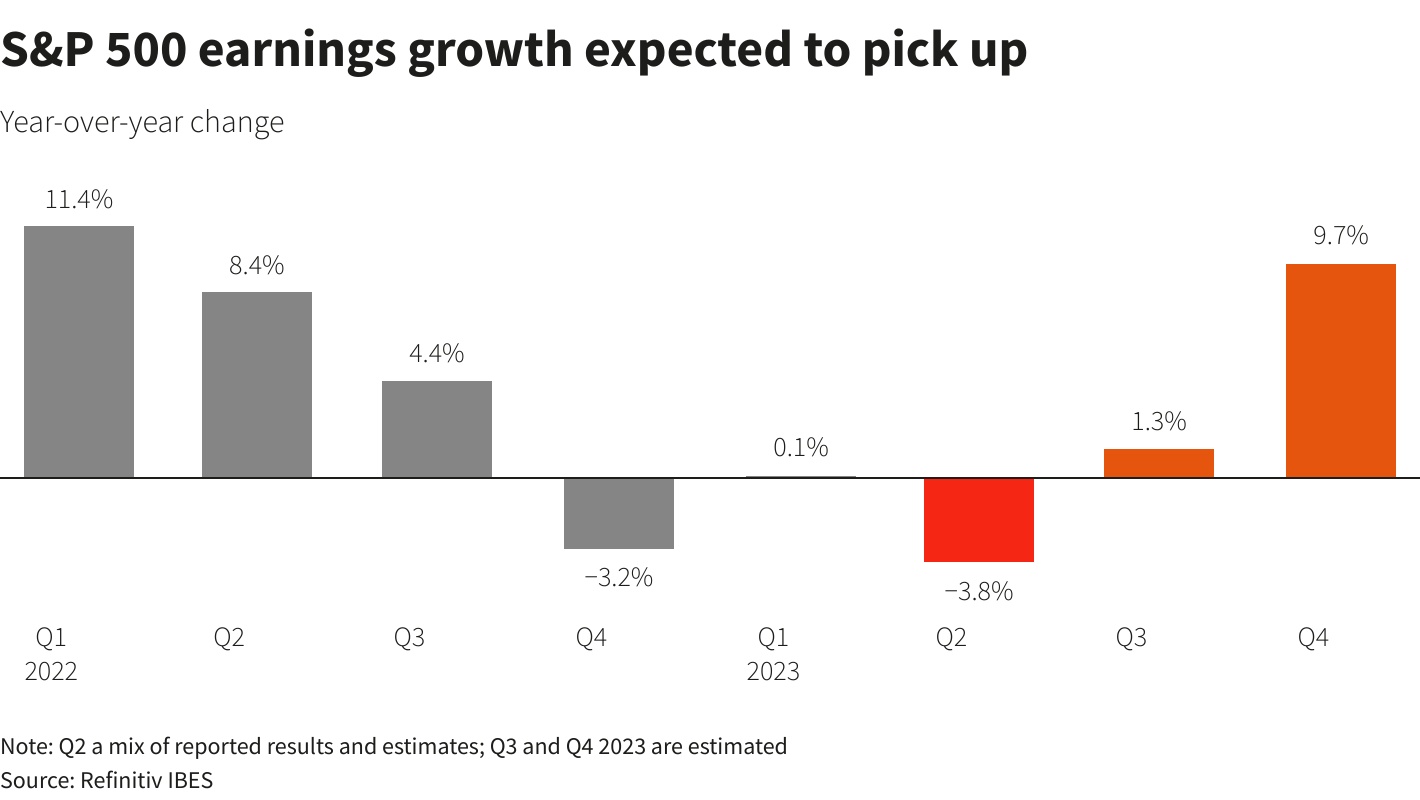 Refinitiv IBES的数据显示,投资者预计,标普500指数成份股公司第三季度盈利将同比增长1.3%,第四季度同比增长9.7%,2024年全年将增长11.9%。