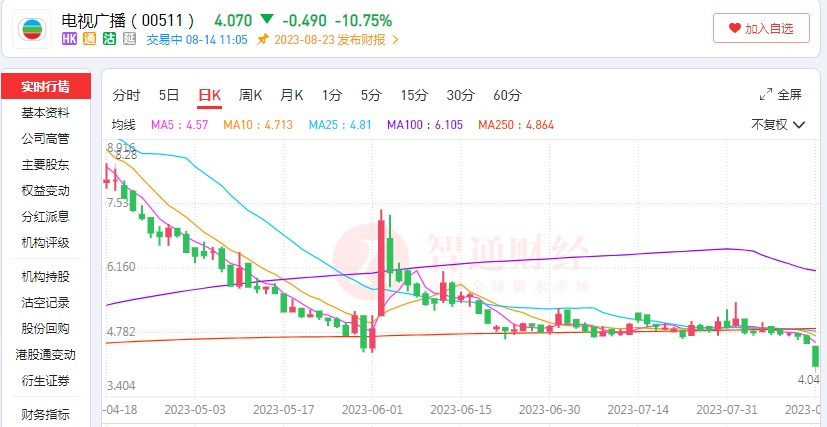 二级市场方面,电视广播股价自今年3月9日创下17.90港元/股的阶段性高点以来,持续下跌,截止发稿,报4.07港元/股,期间累计跌幅接近80%。