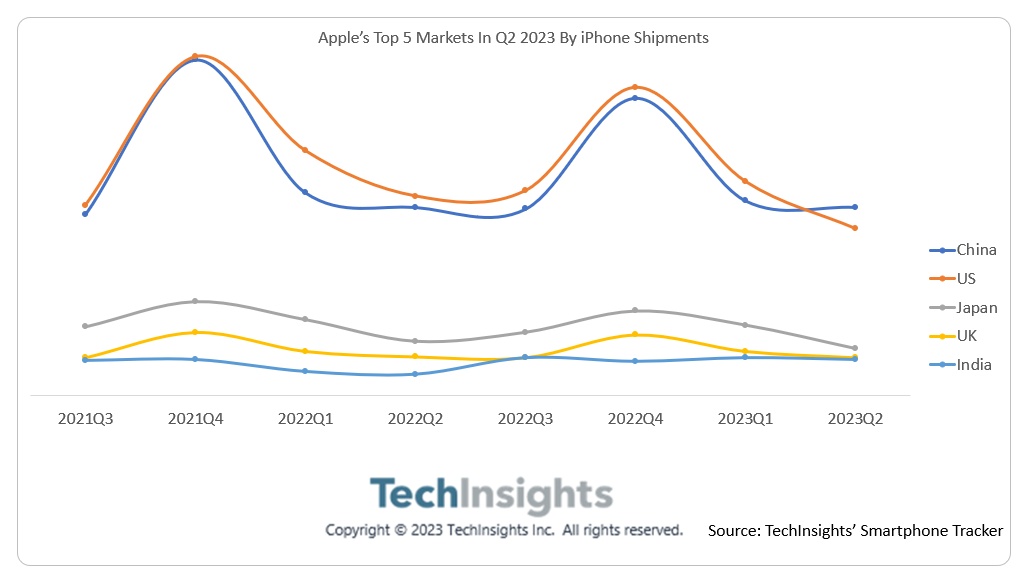 智通财经APP获悉,TechInsights指出,苹果(AAPL.US)iPhone该季度出货量在印度同比增长超过50%。印度现在是苹果在销售和制造方面重要的战略市场。2023年Q2,印度成为苹果的第五大市场。