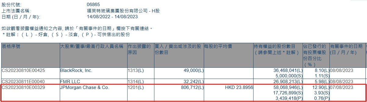 智通财经APP获悉,香港联交所最新资料显示,8月7日,小摩减持福莱特玻璃(06865)80.6712万股,每股作价23.8956港元,总金额为1927.69万港元。减持后最新持股数目约为5806.89万股,最新持股比例为12.90%。