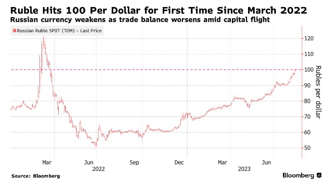 智通财经APP获悉,尽管俄罗斯央行试图在2023年剩余时间停止在国内市场购买外汇来遏制卢布的暴跌,但美元兑卢布汇率在周一仍突破了100的重要心理关口,这是自去年3月以来的首次。