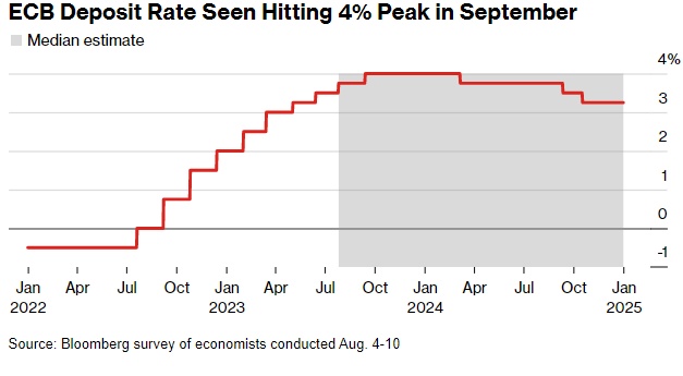 智通财经APP获悉,尽管最近有迹象显示通胀压力正在减弱,但经济学家们仍然预测,欧洲央行将于下个月进行最后一次加息。媒体进行的一项调查显示,受访经济学家们预计9月份欧元区存款利率将从目前的3.75%上调至4%。与此同时,受访经济学家们预计欧洲央行的官员们将在明年3月份开始削减欧元区借贷成本,比他们此前预计的要早一个月。