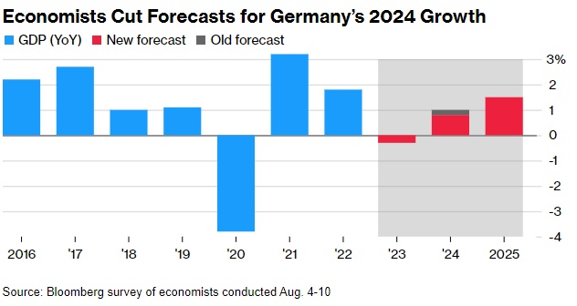 尽管欧元区迄今为止躲过了一场经济衰退,而且很可能会继续避开经济衰退,但其最大经济规模的成员国德国却遭遇了冬季经济低迷,并在第二季度陷入经济增长停滞。受访经济学家们预计,在截至9月份的三个月里,德国经济将再次出现零增长。经济学家预期数据显示,今年德国的经济产出仍将萎缩大约0.3%,对2024年的经济增长预期也从此前的1%预期下调至0.8%。