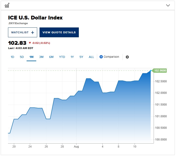 此外,美元自7月底以来也一直呈上升趋势,据悉,美元指数从7月13日的低点99.77攀升至目前的102.83。