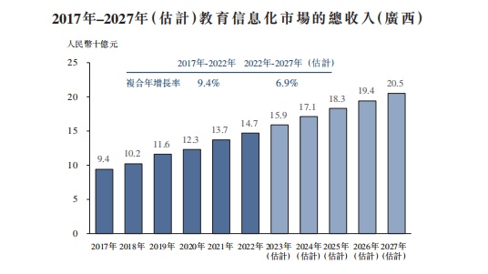 具体到广西,在政府的大力支持及IT教育公共支出增加的情况下,广西教育信息化市场的总收入有望在未来五年内保持增长,到2027年将达到人民币205亿元,2022年至2027年的复合年增长率达6.9%。