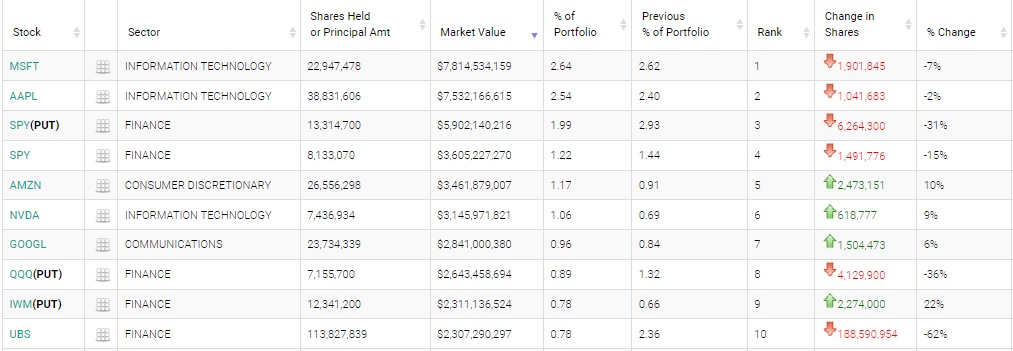 在前五大重仓股中,微软(MSFT.US)位列第一,持仓2294.75万股,持仓市值约为78.15亿美元,占投资组合比例为2.64%,持仓数量较上季度下降7%,连续第二个季度减持。