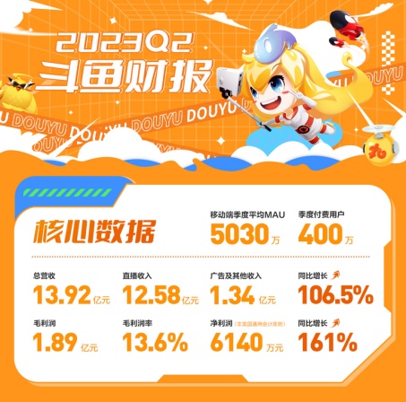 北京时间8月14日,斗鱼(DOYU.US)发布了2023年第二季度未经审计的财务报告。第二季度,斗鱼继续执行长期可持续的发展策略,通过丰富和活跃平台游戏社区生态,以优质的内容服务和产品体验驱动平台用户规模保持稳定。同时,斗鱼继续减少低转化率的营销获客投入,推出多元化的营收活动,升级会员体系等创新营收产品,促进平台用户付费意愿和付费粘性得以提升,从而实现持续性盈利。