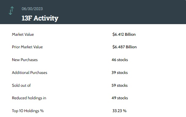 据统计,该基金第二季度持仓总市值为64.12亿美元,上一季度总市值为64.487亿美元,环比略微下降。该基金在第二季度的持仓组合中新增了46只个股,增持了39只个股。该基金还减持49只个股并清仓了59只个股。其中,前十大持仓标的占总市值的33.23%。