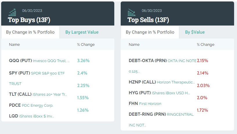 从持仓比例变化来看,前五大买入标的分别是:纳指100ETF看跌期权、SPDR标普500ETF信托、iShares 20年期以上美国国债ETF(TLT.US,CALL)、PDC Energy(PDCE.US)和iShares iBoxx $ Ivmt Grade Coporate Bond ETF。