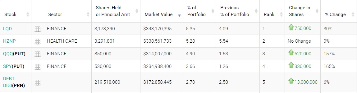 Horizon Therapeutics(HZNP.US)位列第二,持仓市值约为3.39亿美元,持仓数量较上季度没有变化,占投资组合比例为5.28%;纳指100ETF看跌期权(QQQ.US,PUT)位列第三;SPDR标普500ETF信托(SPY.US)位列第四,持仓约53万股,持仓市值约2.35亿美元,占投资组合比例为3.66%;DigitalOcean(DOCN.US)票据位列第五。