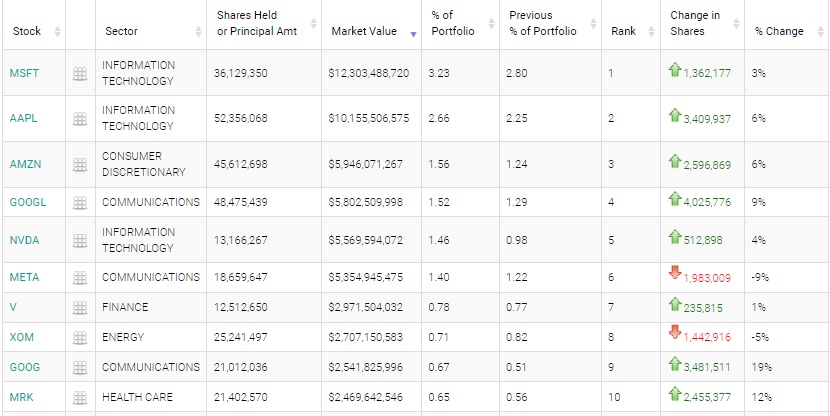 在前五大重仓股中,微软(MSFT.US)位列第一,持仓约3612.94万股,持仓市值约123.03亿美元,占投资组合比例为3.23%,较上季度持仓数量增加3%。