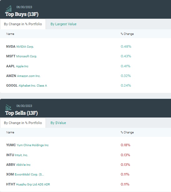 前五大卖出标的分别是:百胜中国(YUMC.US)、财捷(INTU.US)、艾伯维(ABBV.US)、埃克森美孚等。