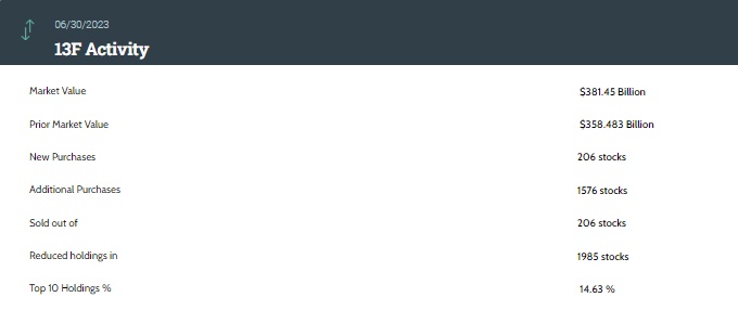 据统计,景顺Q2持仓总市值达3814.5亿美元,上一季度总市值为3584.83亿美元,环比增长6.41%。景顺在第二季度的持仓组合中新增了206只个股,增持了1576只个股。同时,景顺还减持了1985只个股,清仓了206只个股。其中前十大持仓标的占总市值的14.63%。