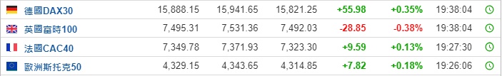 2. 截至发稿,德国DAX指数涨0.35%,英国富时100指数跌0.38%,法国CAC40指数涨0.13%,欧洲斯托克50指数涨0.18%。