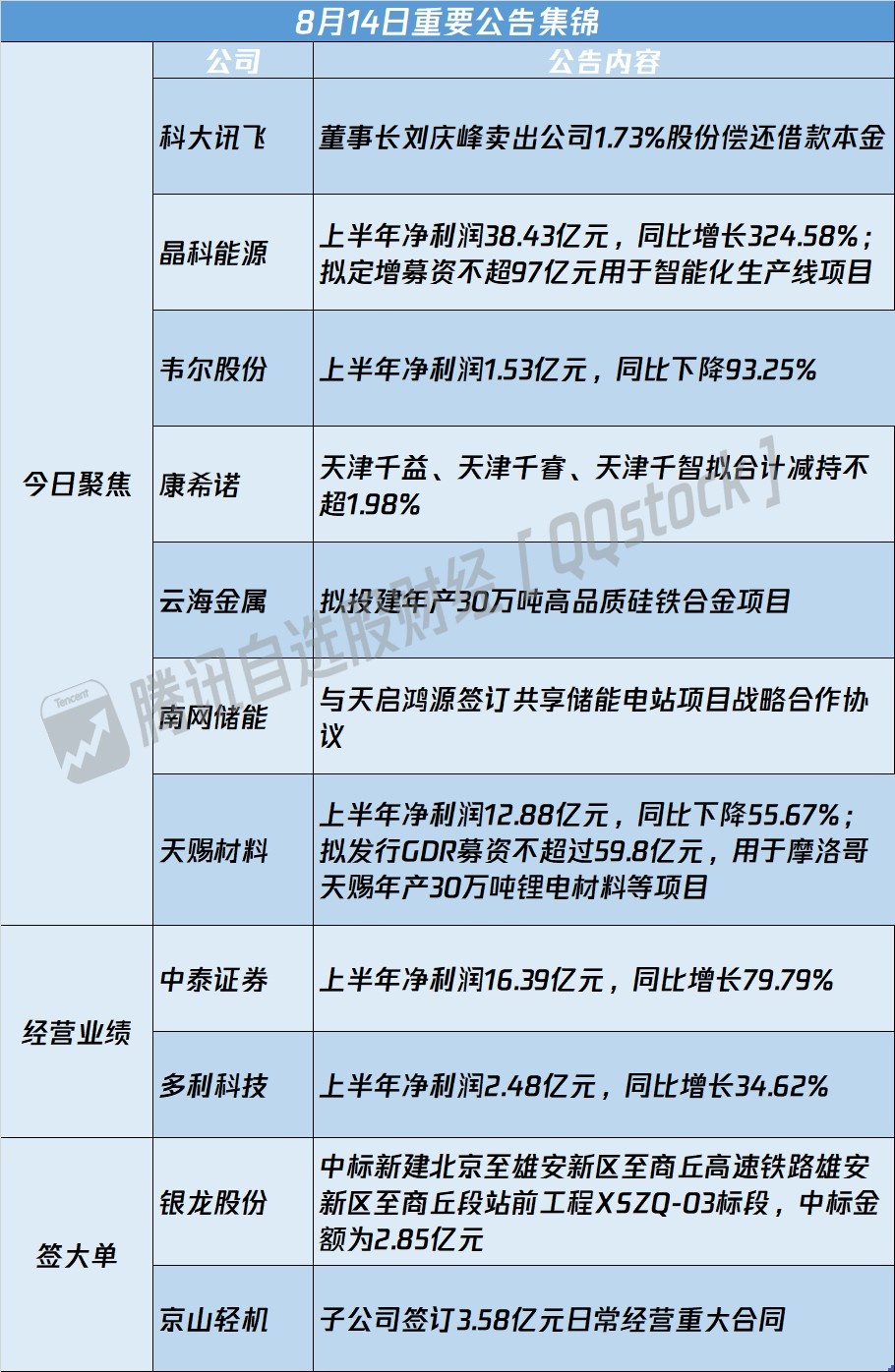 2、晶科能源:上半年净利润38.43亿元,同比增长324.58%;拟定增募资不超97亿元用于智能化生产线项目