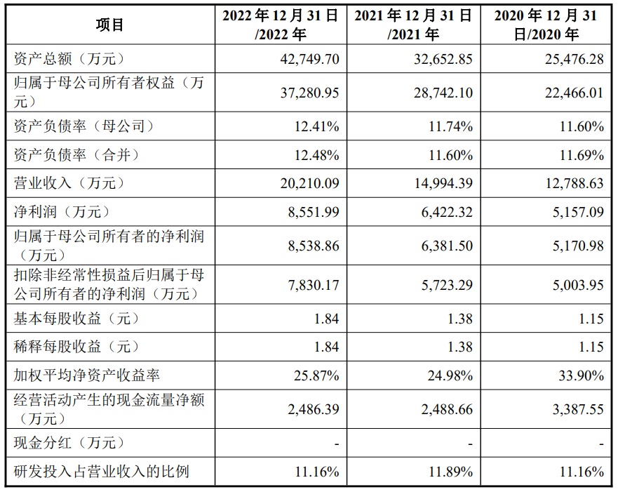 财务方面,于2020年度、2021年度及2022年度,公司实现营业收入分别约为1.28亿元、1.50亿元、2.02亿元。公司净利润分别约为5157.09万元、6422.32万元、8551.99万人民币。