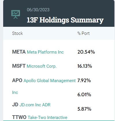 在前五大重仓股中,重仓Meta Platforms(META.US)(持股市值24.6亿美元,占投资组合比例为20.54%)、微软(MSFT.US)(19.3亿美元,16.13%)、阿波罗(APO.US)(9.479亿美元,7.92%)、京东(JD.US)(7.193亿美元,6.01%)、Take-Two互动软件(TTWO.US)。