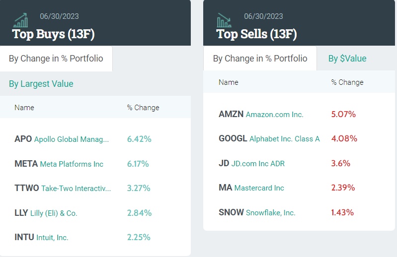 从持仓比例变化来看,前五大买入标的包括阿波罗全球管理、Meta、Take-Two互动软件、礼来(LLY.US)、财捷(INTU.US)。卖出主要的标的包括亚马逊(AMZN.US)、谷歌(GOOGL.US)、万事达(MA.US)、Snowflake(SNOW.US)等。