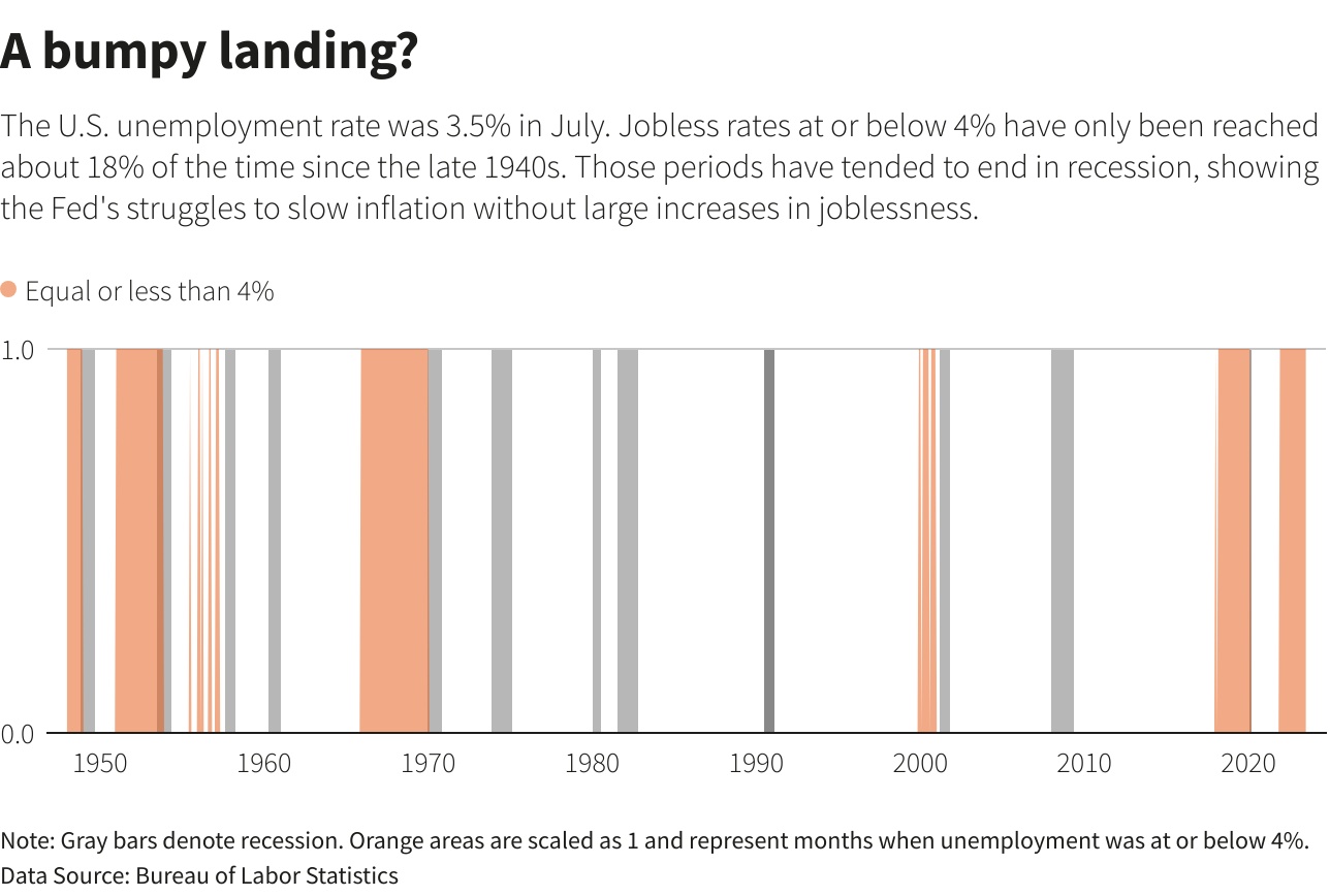 悲观的美联储观察人士认为,要使通胀回落至美联储2%的目标,就需要经济衰退和大规模失业来为持续的物价上涨降温。历史数据也支持这种观点。学术研究和其他研究得出的结论是,过去两年的通胀水平不可能在不出现经济衰退的情况下得到解决。有经济学家预测,美国失业率可能会从目前的3.5%飙升至5%-10%,数百万人将失业,这可能是美联储为实现通胀目标所需要付出的代价。