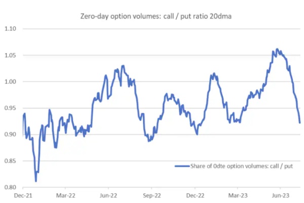 同样值得注意的是,交易员青睐的期权类型发生了转变——从看涨转为看跌。根据Kaiser编制的数据,在过去的20天里,看跌期权的数量比看涨期权的交易数量多了近10%。这与前两个月的情况不同,当时的资金主要是流向看涨期权。他表示:“你可以辩称,由于隐含波动率较低,0DTE期权在战术上是股票期货交易的另一种选择。”