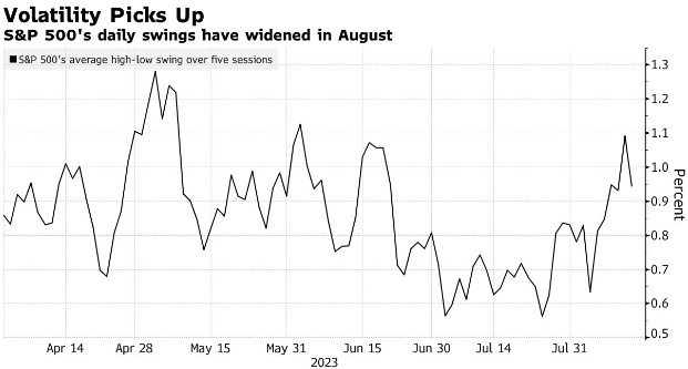 尽管美股三大基准股指刚刚创下2023年以来的最小单周波动之一,但日内走势却显示出不同的情况。数据显示,在截至上周四的五个交易日中,标准普尔500指数的平均盘中波动幅度为1.1%,为去年6月以来的最大波动幅度。尽管与2022年的熊市相比,这一波动幅度不大,但几乎是两周前日均波动幅度的两倍。在过去六个交易日中,该指数期货两次日内抹去0.9%的涨幅,这是自今年2月以来首次出现这种情况。